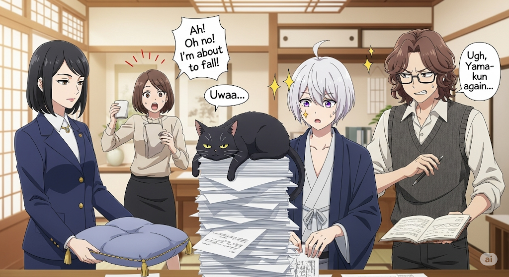 けだるげな黒猫──もとい、AI技術担当ヤマが書類の上にどっかり座っている。