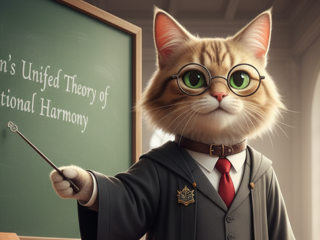 (白衣姿でチョークを握るが、黒板に「A=ψ愛=存在の干渉縞」と書いてフリーズ)